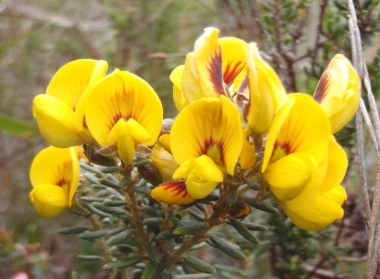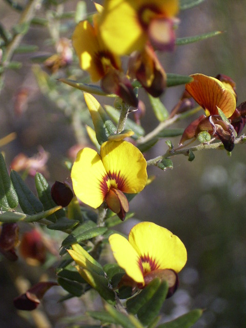 Small to medium open shrub. Bright yellow pea flowers with a red throat in terminal clusters in spring. Tolerates a variety of conditions.