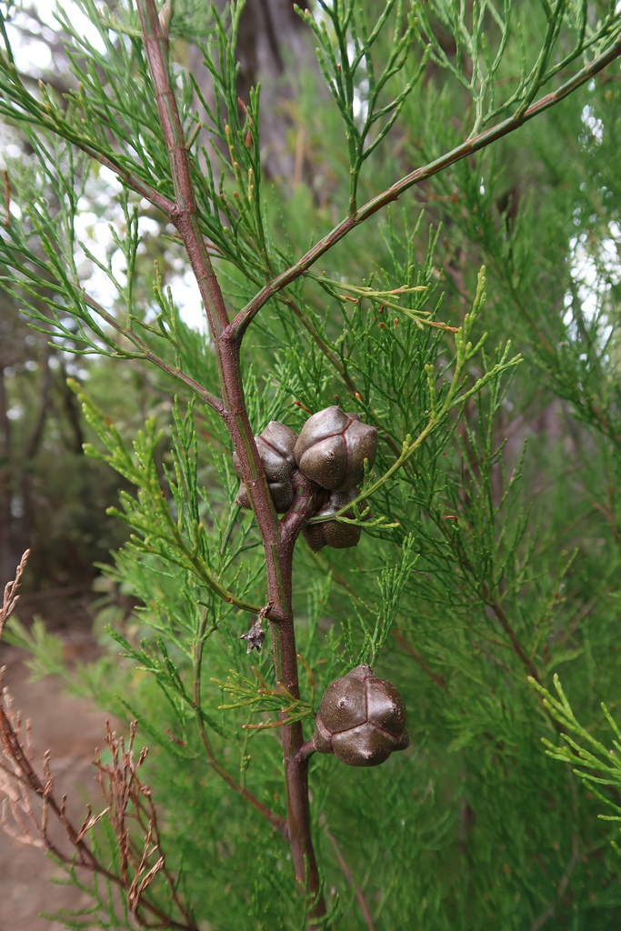 Tall shrub or small tree. Clusters of cones form on short branches. Often forms an elegant dense tree in suburban gardens. Prefers well-drained soil and some sun.