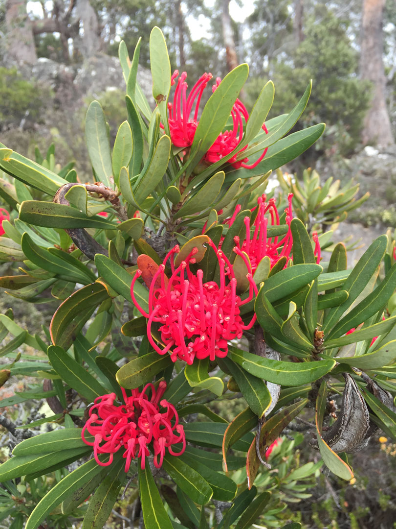 Upright shrub or small tree. Showy terminal scarlet/red flower heads up to 8cm across with 15-20 small flowers. Bird attracting. Best results at higher altitude in well-drained cool moist sites.