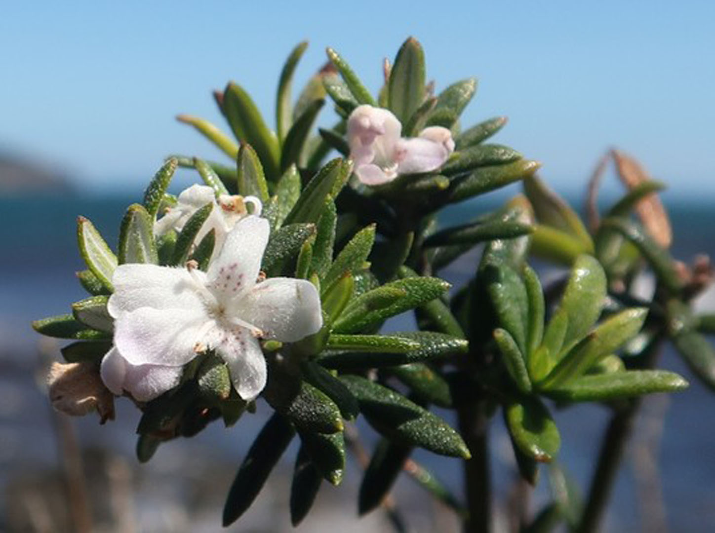 Small to medium shrub with tiny narrow leaves. Numerous small, white, occasionally blue, flowers in the leaf axils in spring/summer. Bird attracting.