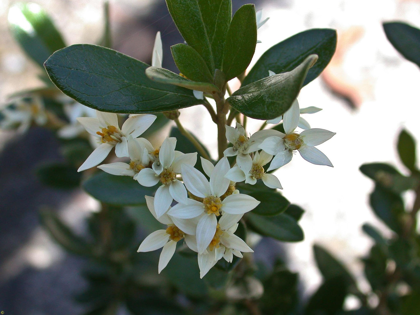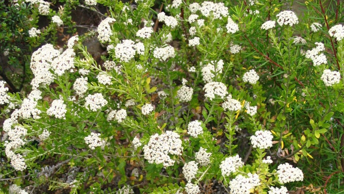 Compact, hardy coastal shrub with grey/green foliage and white star-shaped flowers late summer to early spring. Bird attracting. A good low wind break or hedge. Prefers well-drained soil.