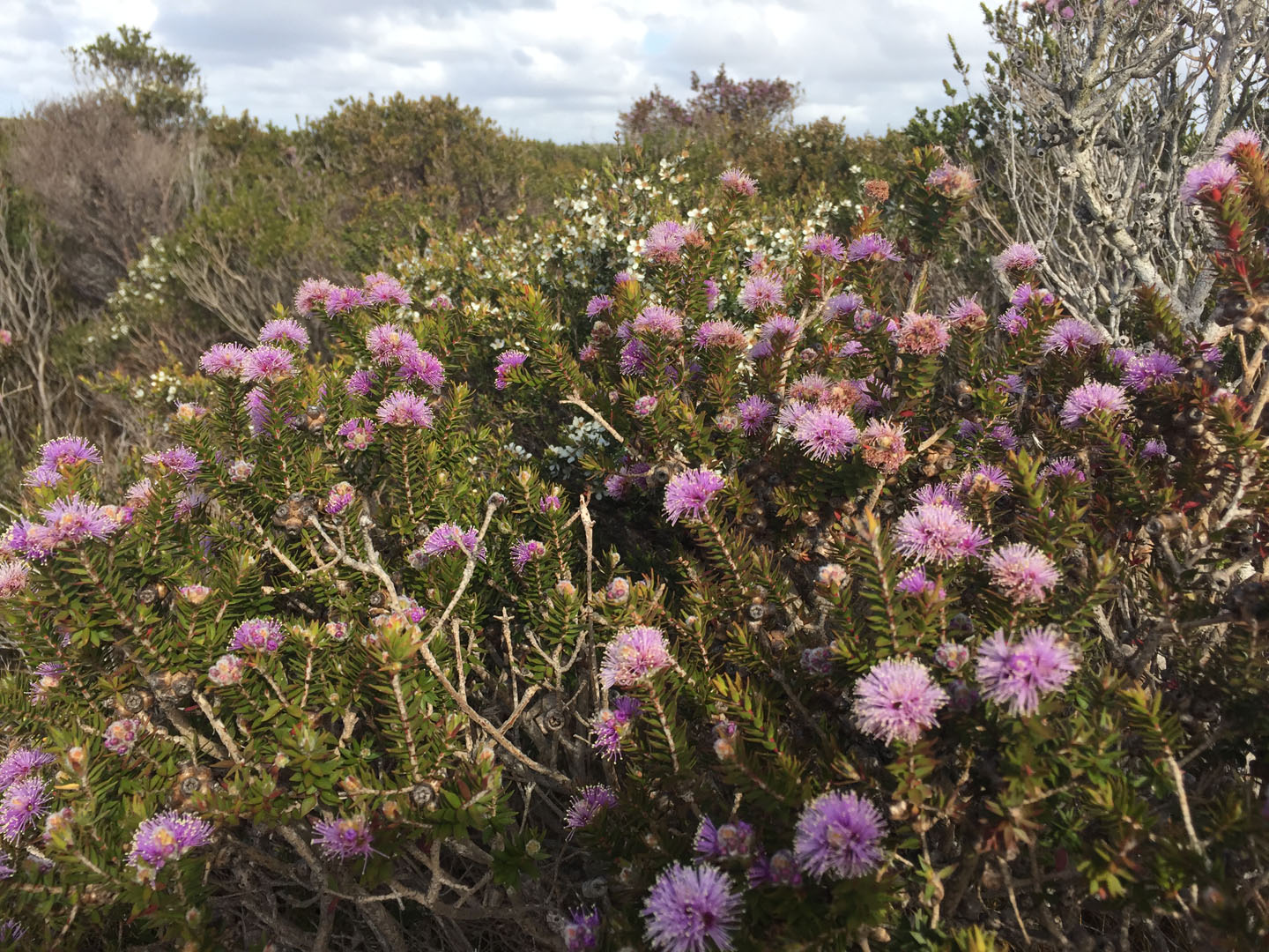 Low spreading much-branched shrub with branches covered with dense fine white hairs. Leaves are tiny, fleshy and stalkless. Daisy flowers are pink/white and profuse in summer and autumn. Bird attracting.