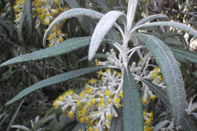 Tall shrub with leaves 6-15cm long. Numerous white daisies in loose clusters in spring. Bird and insect attracting.