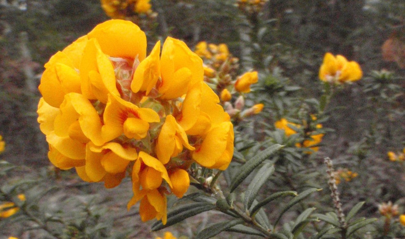 Spreading, much-branched shrub with perfumed golden yellow pea flowers in dense terminal clusters in spring. Seed pods have silky hairs. Nitrogen nodules in the roots - good for revegetation.
